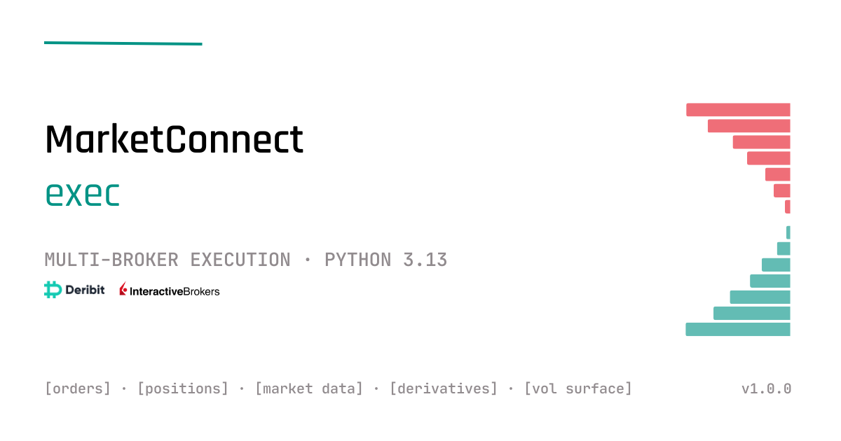 marketconnect-exec is available as a standalone Python package. Whether you are running a systematic options strategy on Deribit, managing an equity portfolio through Interactive Brokers, or building a multi-broker execution system, the library gives you a clean, extensible foundation without having to maintain broker-specific integration code.