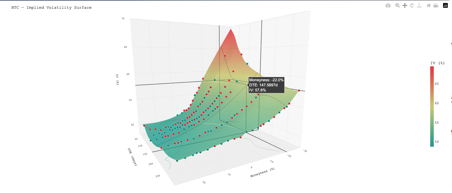 Graphique de la surface de volatilité du Bitcoin depuis Deribit APIGraphique de la courbe futures du Bitcoin recupérée depuis Deribit API