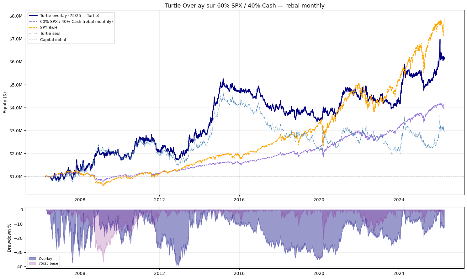 print(f"\n{'='*65}")dd_base = metrics(base, INITIAL_CAP,"60% SPX / 40% Cash (base)")dd_turtle = metrics(turtle_equity, INITIAL_CAP,"Turtle alone")dd_combined = metrics(combined, INITIAL_CAP,"Turtle Overlay on 60/40")_ = metrics(spx_full, INITIAL_CAP,"SPY B&H")print(f"{'='*65}")
