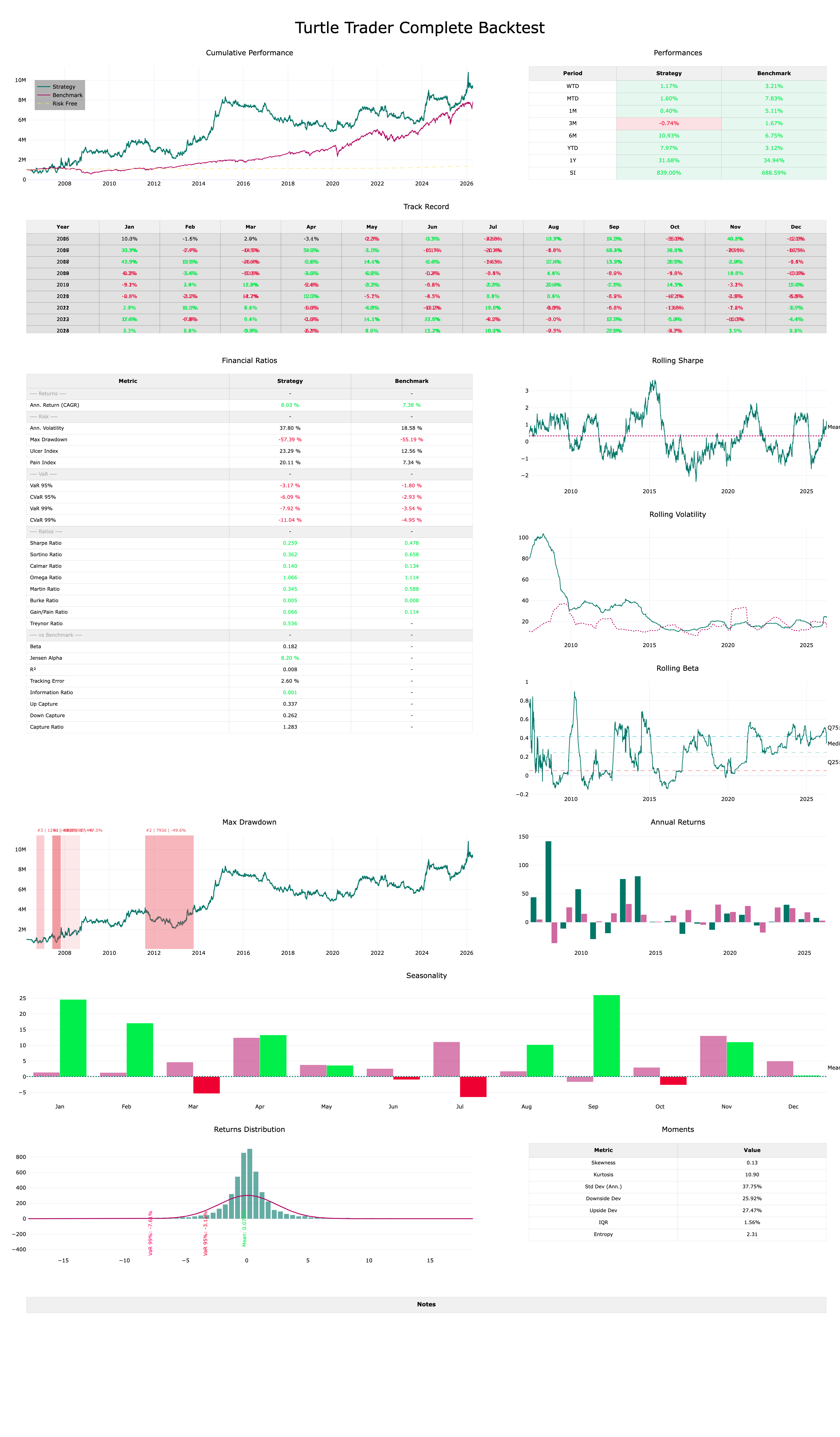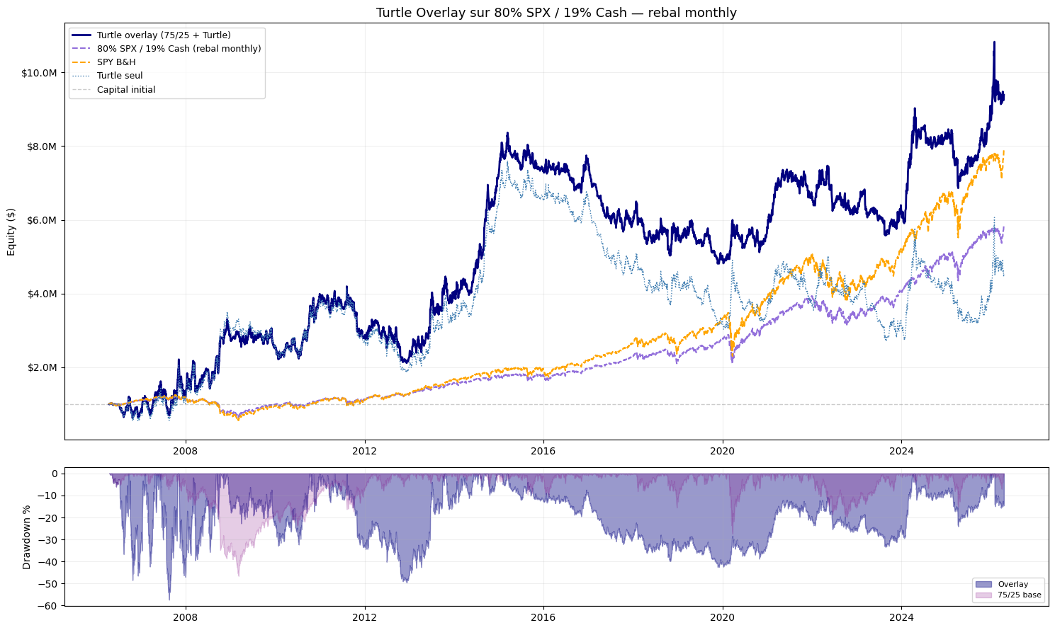 A word of honesty: beating SPY over a specific 20-year window does not mean this configuration will always win. The 0.9% risk per unit produces larger drawdowns when the Turtle is wrong, and those drawdowns compound on top of the equity drawdown from the 80% SPX allocation. The 2008 period is particularly brutal for this configuration. The outperformance is real on this backtest, but the path to get there is significantly rougher than pure SPY. The Sharpe is lower, and the maximum drawdown is higher. It is a higher-volatility, higher-return profile — not a free lunch.