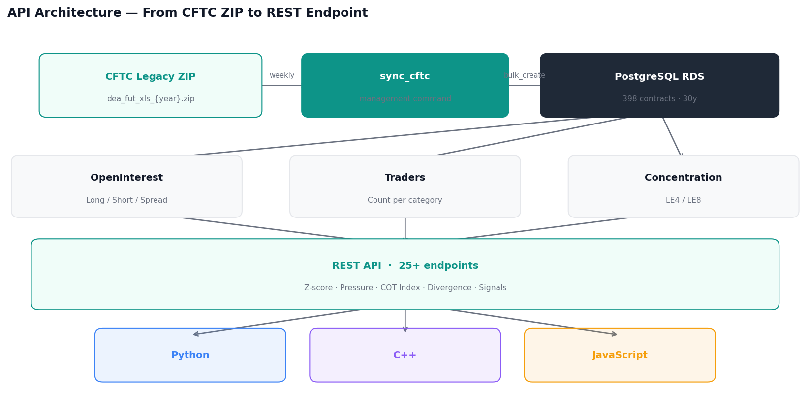 La CFTC publie chaque vendredi 30 ans de données de positionnement sur les futures — enfouis dans un fichier ZIP hérité avec 300 colonnes et aucune API. Nous en avons construit une. Une API REST qui ingère, normalise et expose les données COT sur 398 contrats futures avec Z-scores, métriques de pression, COT Index et signaux de divergence calculés à la volée. Architecture complète : Django ORM, pipeline de sync incrémental, authentification par clé API, et snapshot Z-score en direct sur tous les contrats mainstream.