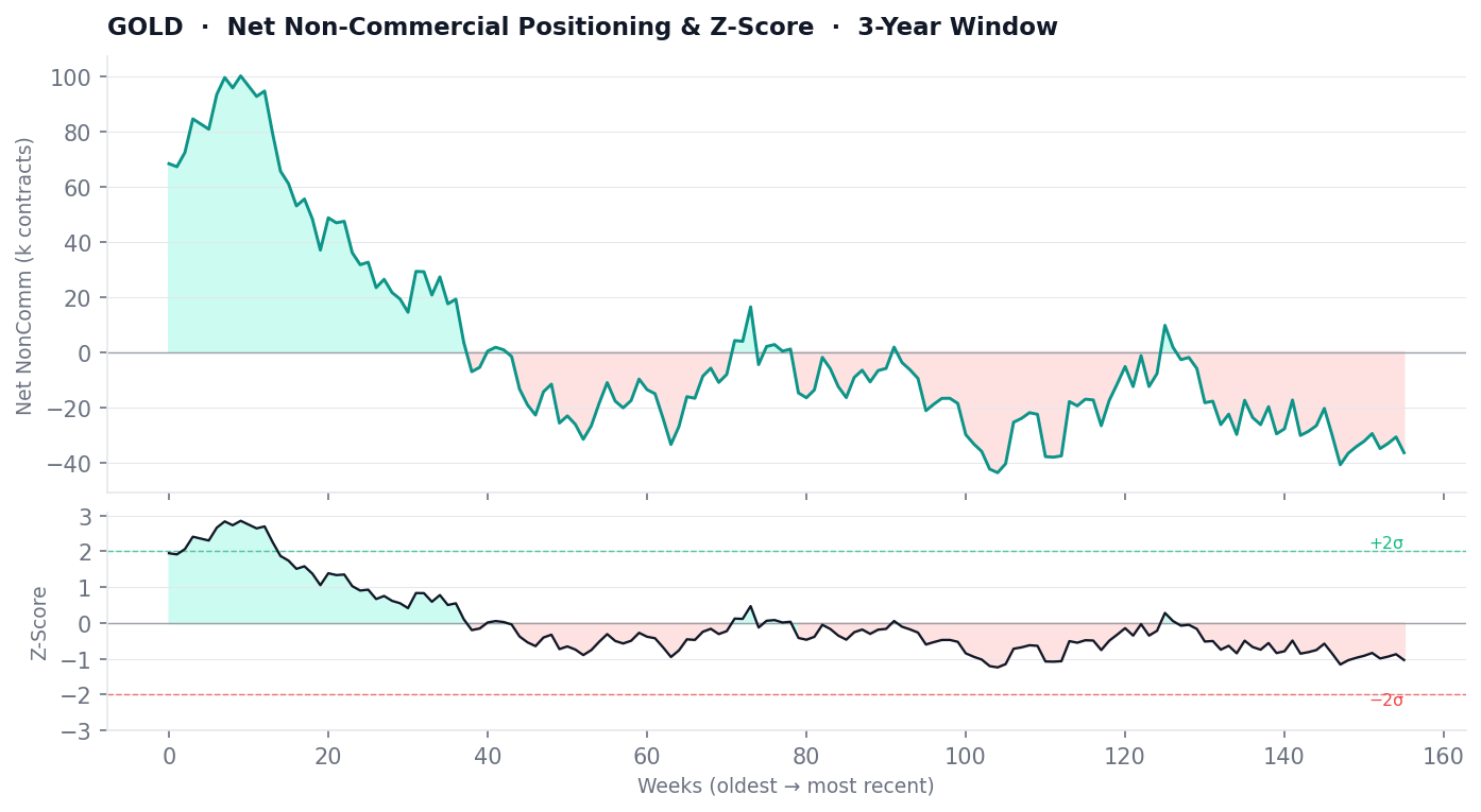 L'API actuelle couvre le rapport Legacy Futures Only — Non-Commercial, Commercial, Non-Reportable. Le prochain build ajoute le format Disaggregated (Producteurs/Marchands, Swap Dealers, Managed Money, Other Reportables), qui donne une image plus précise de qui pilote réellement les mouvements de positionnement. Managed Money — la catégorie COT qui correspond le plus précisément aux hedge funds systématiques — est un signal plus propre que le bucket Non-Commercial hérité, qui mélange trend-followers, fonds macro et dealers d'options.