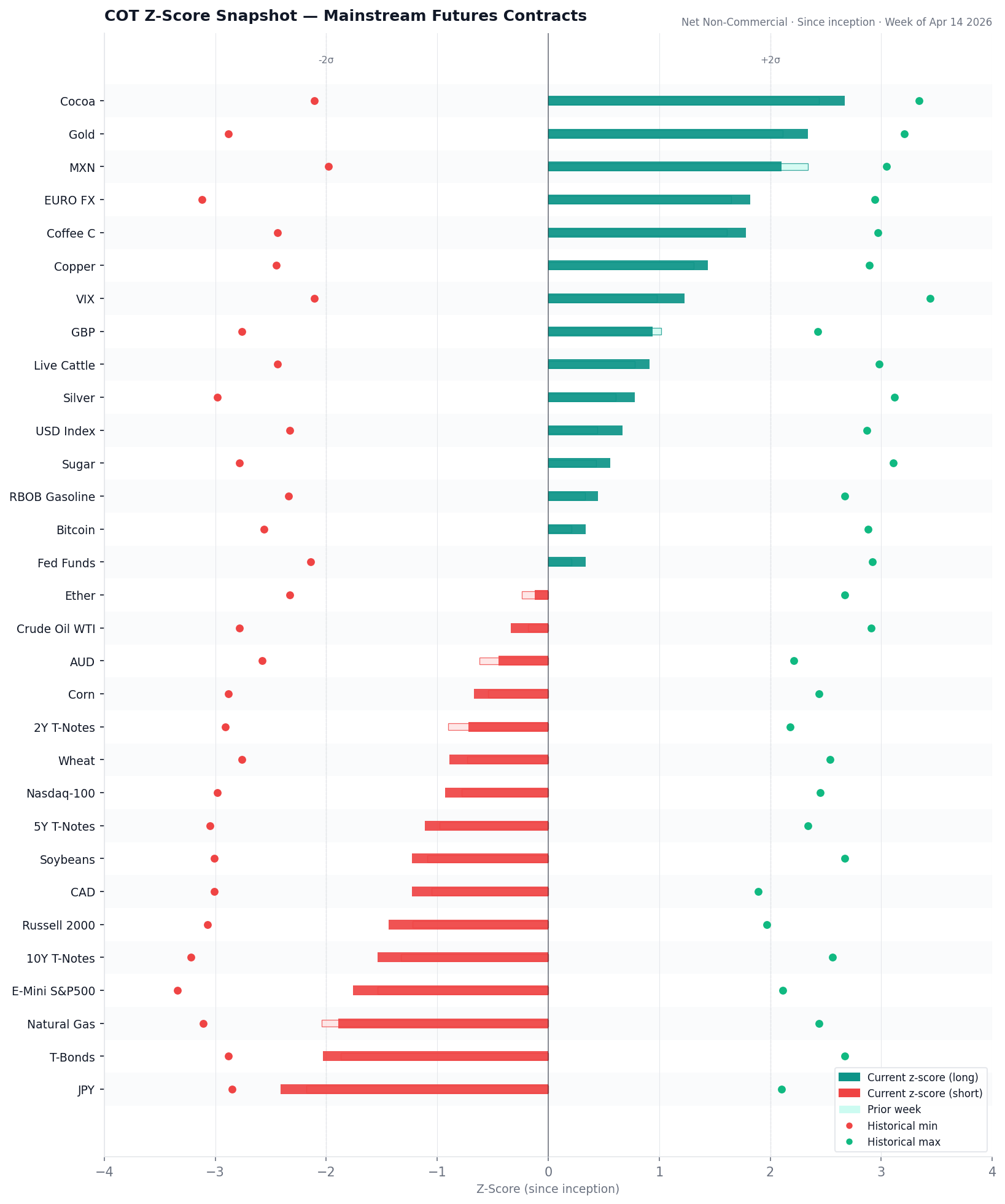 Le graphique ci-dessous montre où se situe chaque contrat futures mainstream sur son Z-score — calculé depuis l'inception sur l'historique complet disponible de chaque contrat. Le point rouge indique le minimum historique (positionnement short le plus extrême jamais enregistré), le point vert indique le maximum historique. La barre foncée est le Z-score actuel. La barre claire est le Z-score de la semaine précédente.